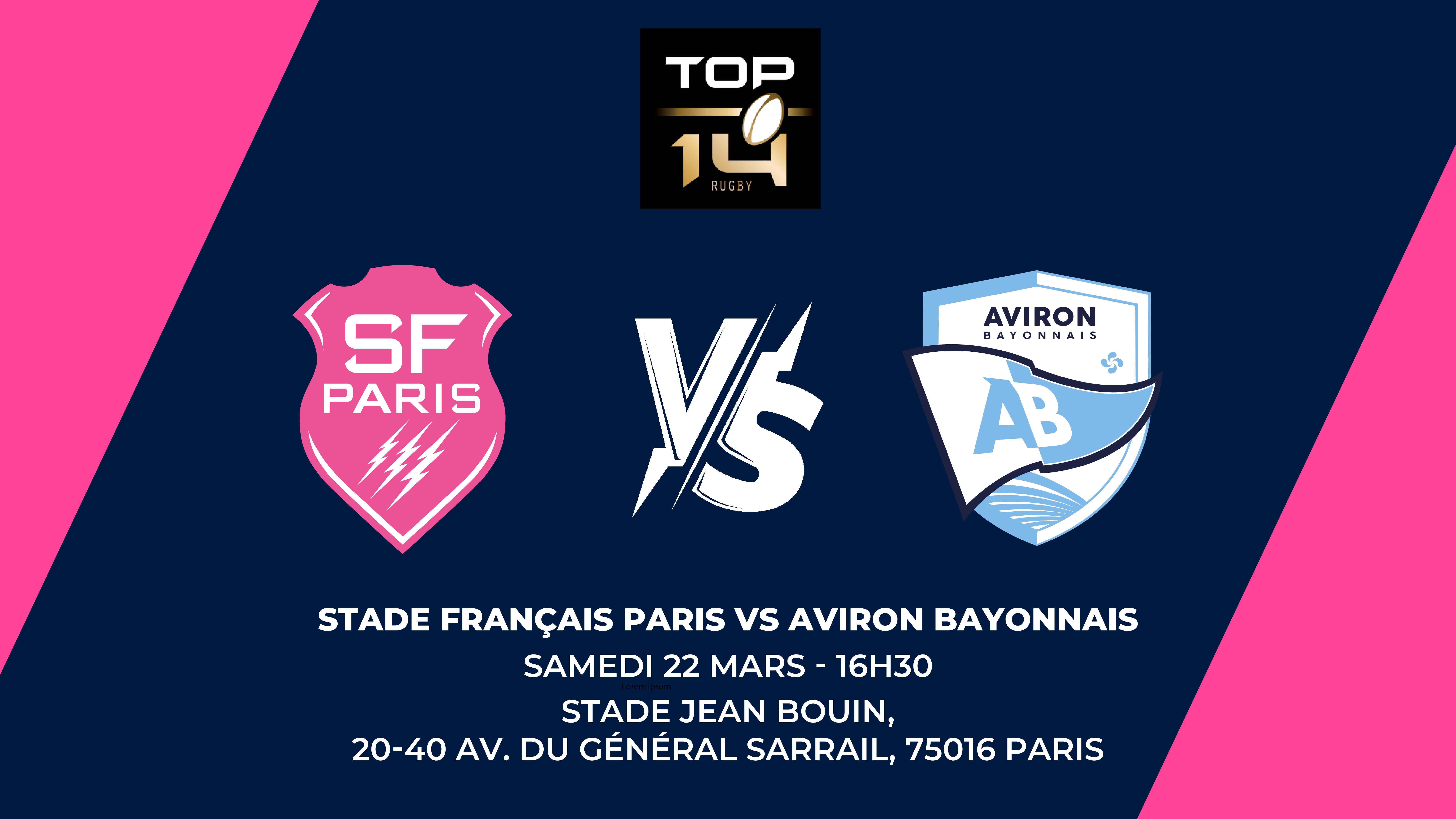Le Stade Français Paris reçoit l’Aviron Bayonnais le samedi 22 mars à 16h30 au Stade Jean Bouin 🏟️, pour une rencontre capitale en TOP 14 🏉.